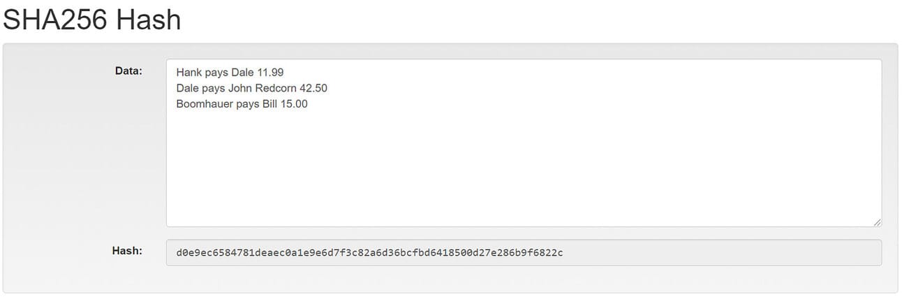 If a single character is changed from this data, the hash changes and is no longer (“d0e9…822c”); thus, you know someone is up to no good and has either changed the names or the amounts. The hash is a quick way of verifying the details haven’t been tampered with.
