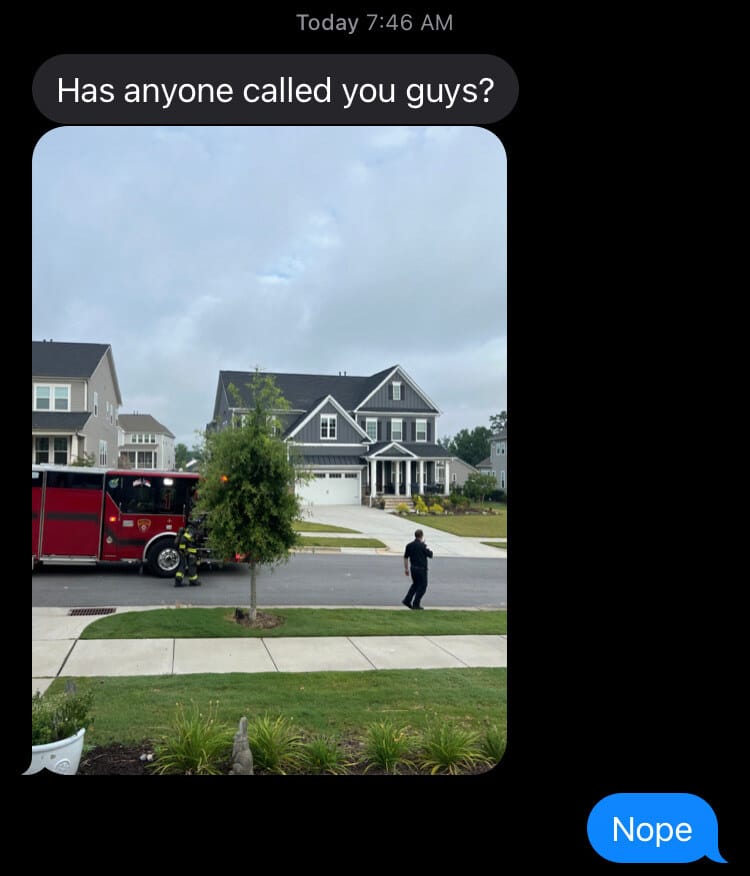 We left July 3 to head over to my parents’ place in Tennessee — about a five hour drive with charging — intending to spend the week over there. On the morning of the 5th, our across-the-street neighbor messaged this: