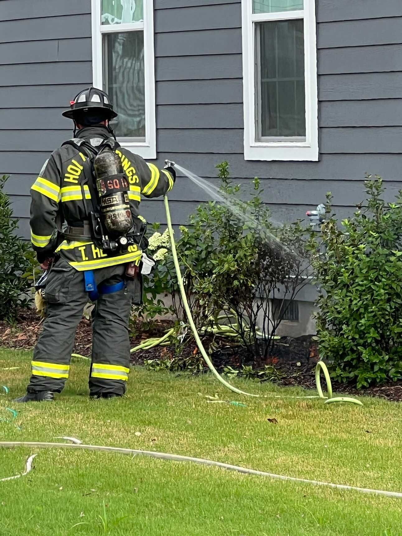 The fire department arrives and also tries to put out the fire, unsuccessfully. Suspecting a gas leak, they call the gas company (Dominion). While waiting for Dominion, the firefighters keep the side of the house nice and cool. You can kind of make out the flames around our ‘burning bush’ in the photo.